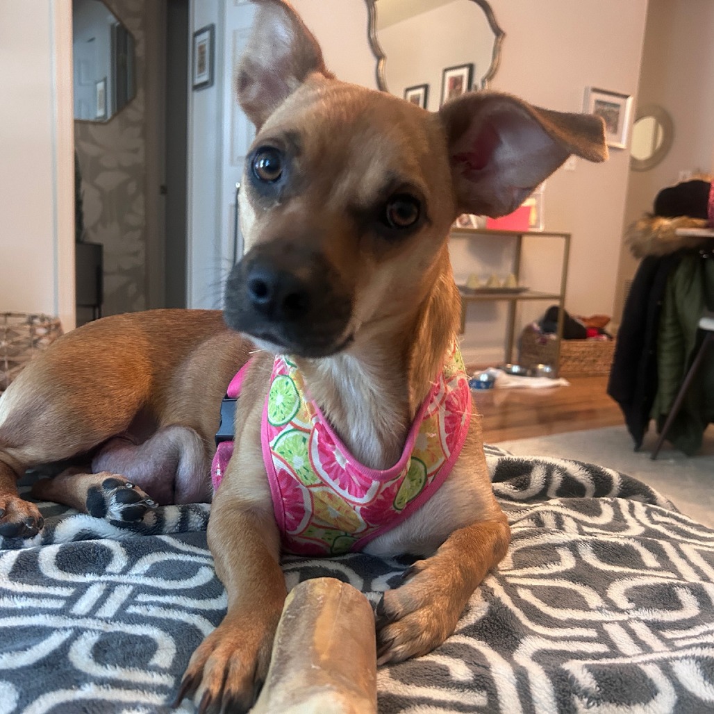KNOWN LIKES: Playing, treats, napping, chewing, and romping in the sun. She LOVES to cuddle and will lay on top of you if you let her. Once she bonds she is a velcro dog and loves nothing more than to get pets and kisses and cuddles on the couch.
