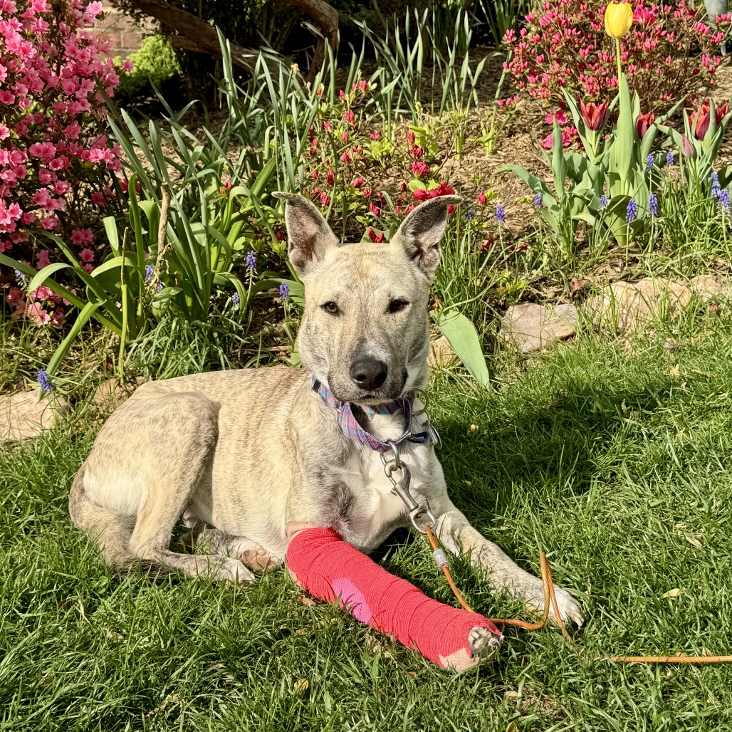 Gravy has been through even more recently — he broke his front leg in early March, and as of April 13th, he is almost fully healed and getting back to his happy, active self. He will begin heartworm treatment in May, which the rescue will cover, and he can absolutely go to his forever home while going through the process.