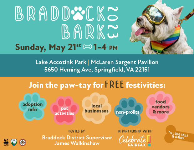 Hosted by Braddock District Supervisor James Walkinshaw in partnership with Celebrate Fairfax, Braddock Bark is a free event that brings the community together to celebrate the love that we have for our pets. The event welcomes well-behaved, leashed dogs to attend, please make sure your dog is up to date on all vaccinations.