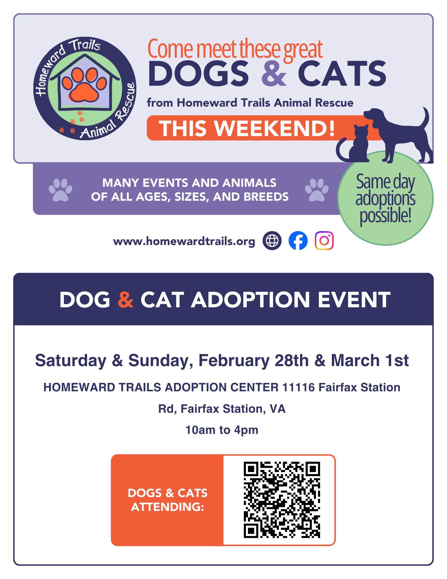 Visit the Homeward Trails Adoption Center every Saturday & Sunday (10 am – 4 pm) to meet adoptable cats & dogs.