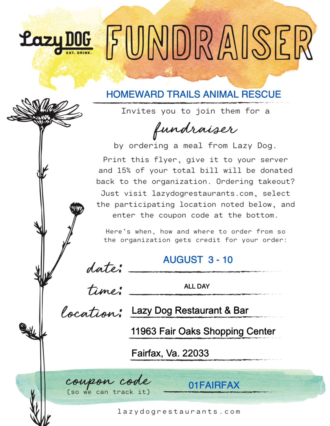 Join us for a Restaurant Week Fundraiser and special adoption event at Lazy Dog Restaurant & Bar in Fairfax at 11963 Fair Oaks Shopping Center, Fairfax, VA 22033. The Restaurant Week Fundraiser is Sunday August 3rd to Sunday August 10th. All orders any day from 8/3 to 8/10 mentioning Homeward Trails will have 15% of their bill donated to HT! Simply bring this printed flyer with you to dine in or use online code 01Fairfax when ordering online from the Fairfax location.